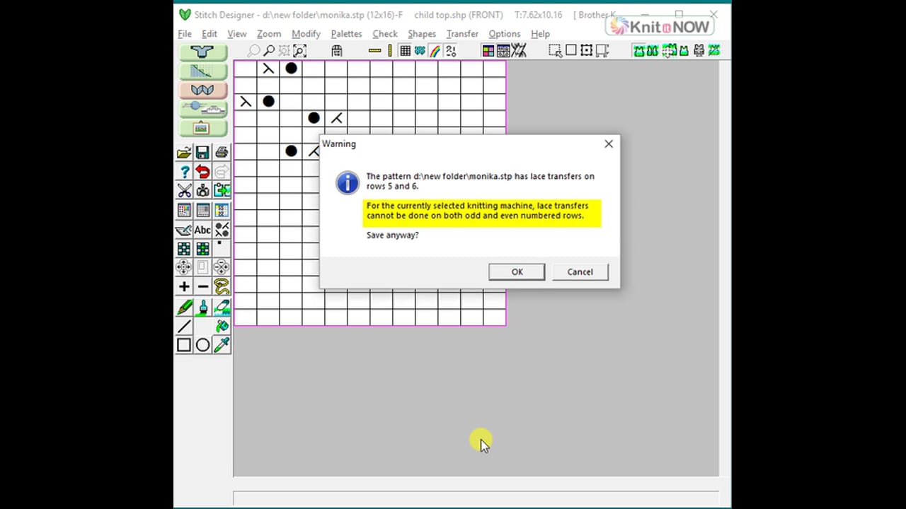 Knitting machine electronics don't recognize the DAK symbols. We design with symbols in DAK so DesignaKnit applies "rules" to make sure the patterns we create are Knit-able. For example, if we try to place 2 eyelets side by side, DAK will warn us and remind us that this can't be done with a lace carriage on a knitting machine.